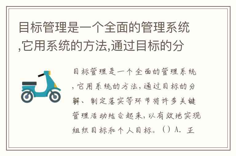 目标管理是一个全面的管理系统,它用系统的方法,通过目标的分解、制定落实等环节将许多关键管理活动结合起来,以有效地实现组织目标和个人目标。( ) A. 正确 B. 错误