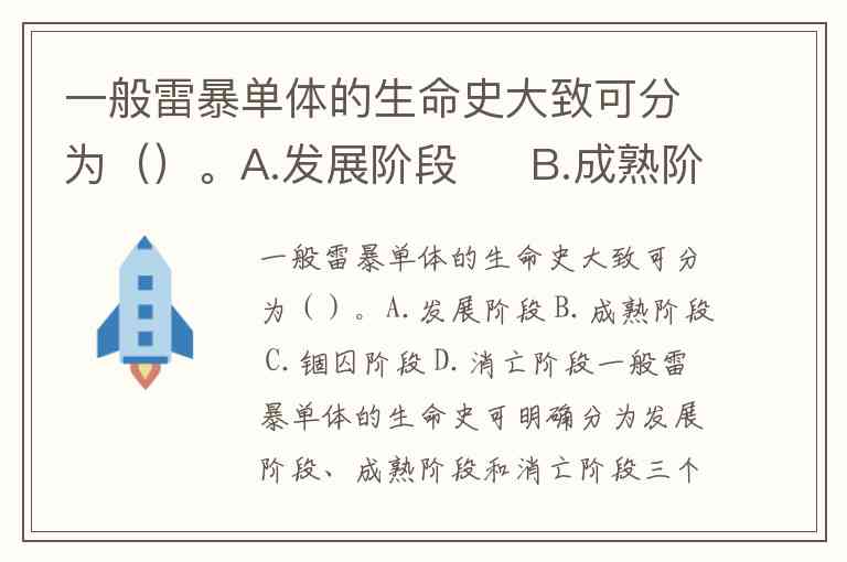 一般雷暴单体的生命史可明确分为发展阶段、成熟阶段和消亡阶段三个连续过程,对应选项中的 A.发展阶段、B.成熟阶段、D.消亡阶段。锢囚阶段(选项C)属于气旋系统的演变阶段,与雷暴单体无关。