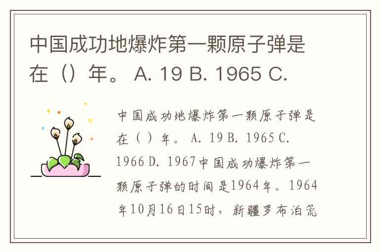 中国成功地爆炸第一颗原子弹是在()年。 A. 19 B. 1965 C. 1966 D. 1967