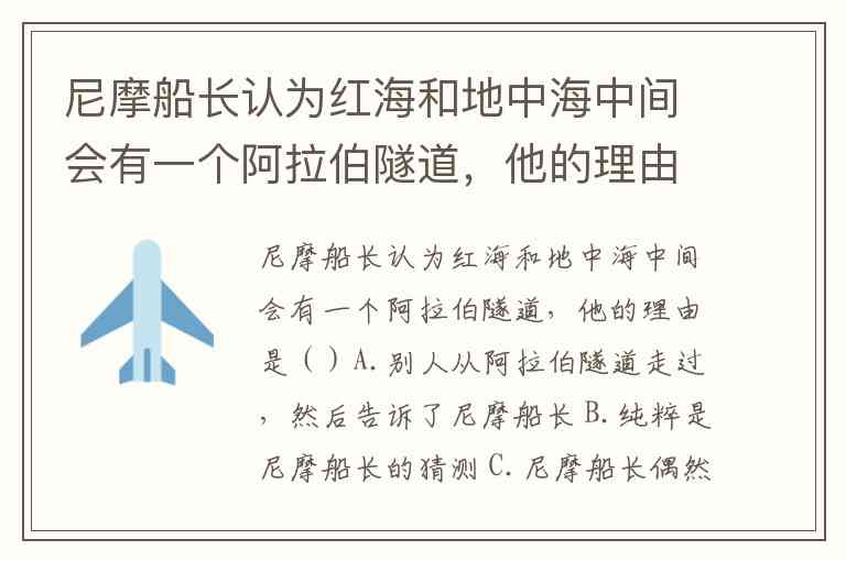 尼摩船长认为红海和地中海中间会有一个阿拉伯隧道,他的理由是()A.别人从阿拉伯隧道走过,然后告诉了尼摩船长 B.纯粹是尼摩船长的猜测 C.尼摩船长偶然发现的 D.尼摩船长根据一些生物学现象进行了推理,继而进行了试验,证明了隧道的存在