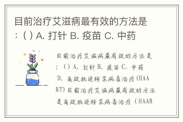 目前治疗艾滋病最有效的方法是:( ) A. 打针 B. 疫苗 C. 中药 D. 高效抗逆转录病毒治疗(HAART)