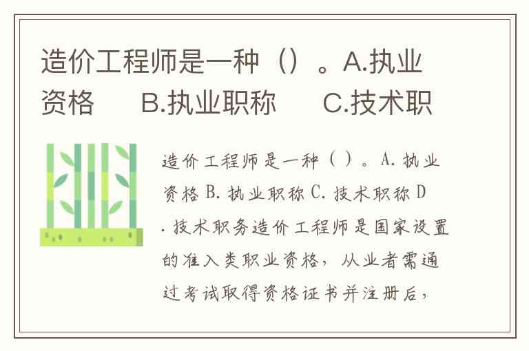 造价工程师是一种()。A.执业资格 B.执业职称 C.技术职称 D.技术职务