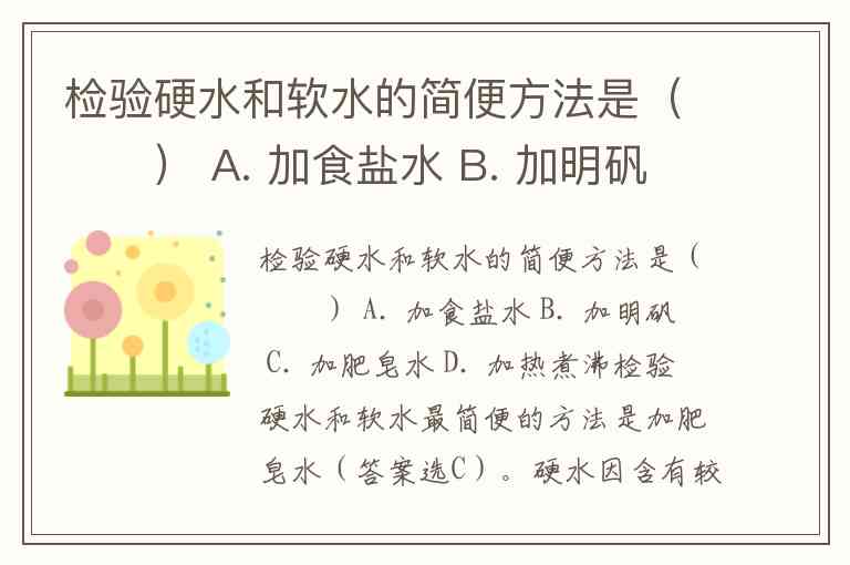 其他选项中,食盐水(A)与钙镁离子不反应,无法区分;明矾(B)主要用于净水沉淀,不能鉴别硬度;加热煮沸(D)虽能使硬水生成水垢,但属于软化方法而非检验手段。生活中还可通过观察烧水壶水垢或毛巾变硬等现象辅助判断,但肥皂水法因其快速直观而成为首选。