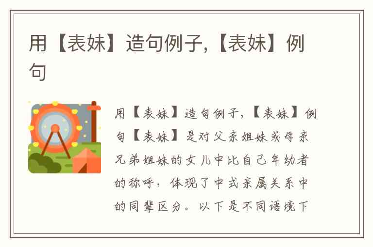 【表妹】是对父亲姐妹或母亲兄弟姐妹的女儿中比自己年幼者的称呼,体现了中式亲属关系中的同辈区分。以下是不同语境下的造句示例:
