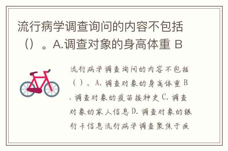 流行病学调查询问的内容不包括()。A.调查对象的身高体重 B.调查对象的疫苗接种史 C.调查对象的家人信息 D.调查对象的银行卡信息