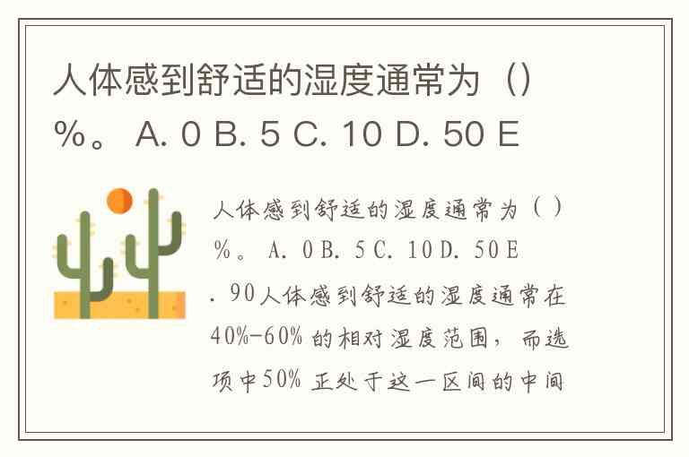 人体感到舒适的湿度通常为()%。 A. 0 B. 5 C. 10 D. 50 E. 90