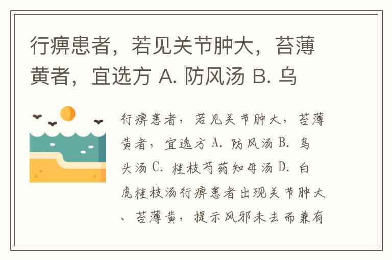 行痹患者,若见关节肿大,苔薄黄者,宜选方 A. 防风汤 B. 乌头汤 C. 桂枝芍药知母汤 D. 白虎桂枝汤