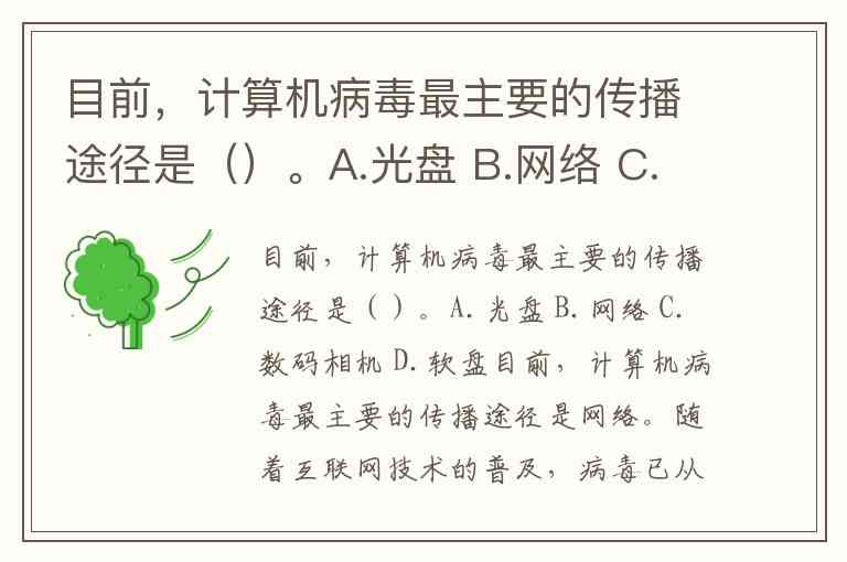 目前,计算机病毒最主要的传播途径是()。A.光盘 B.网络 C.数码相机 D.软盘
