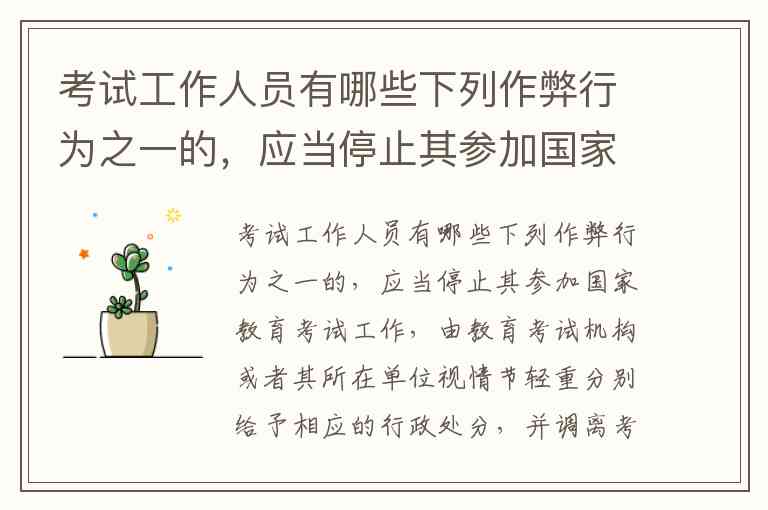 考试工作人员有哪些下列作弊行为之一的,应当停止其参加国家教育考试工作,由教育考试机构或者其所在单位视情节轻重分别给予相应的行政处分,并调离考试工作岗位;情节严重,构成犯罪的,由司法机关依法追究刑事责任()A.在场外组织答卷、为考生提供答案的 B.偷换、涂改考生答卷、考试成绩或者考场原始记录材料的 C.利用考试工作便利,索贿、受贿、以权徇私的 D.应回避考试工作却隐瞒不报的 E.因玩忽职守,致使考生未能如期参加考试的或者使考试工作遭受重大损失的
