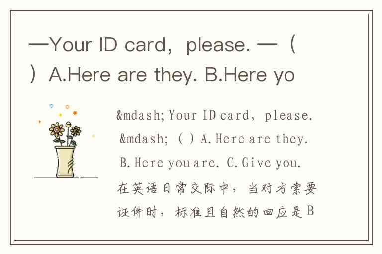 —Your ID card,please. —()A.Here are they. B.Here you are. C.Give you.
