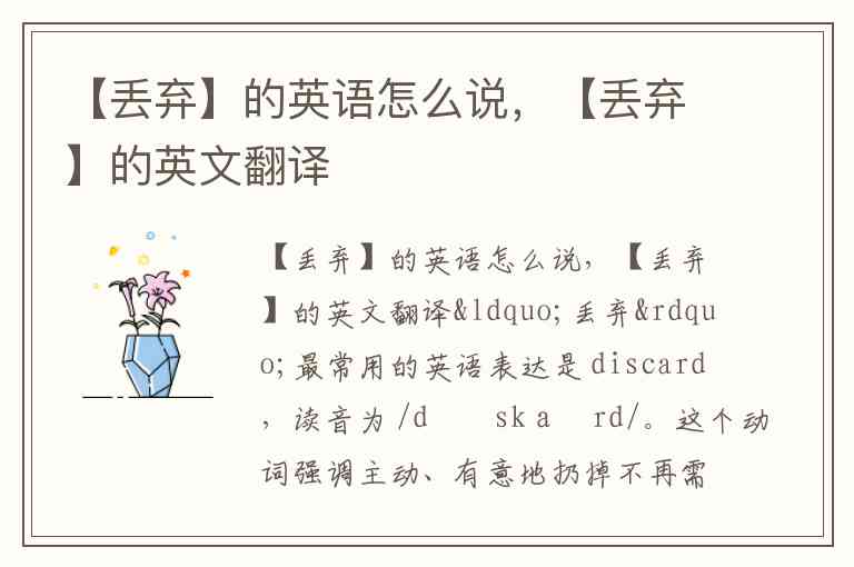 “丢弃”最常用的英语表达是 discard,读音为 /dɪˈskɑːrd/。这个动词强调主动、有意地扔掉不再需要或有用的东西,例如丢弃垃圾、旧物或过时的观念。