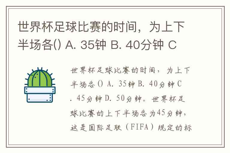 世界杯足球比赛的时间,为上下半场各() A. 35钟 B. 40分钟 C. 45分钟 D. 50分钟。
