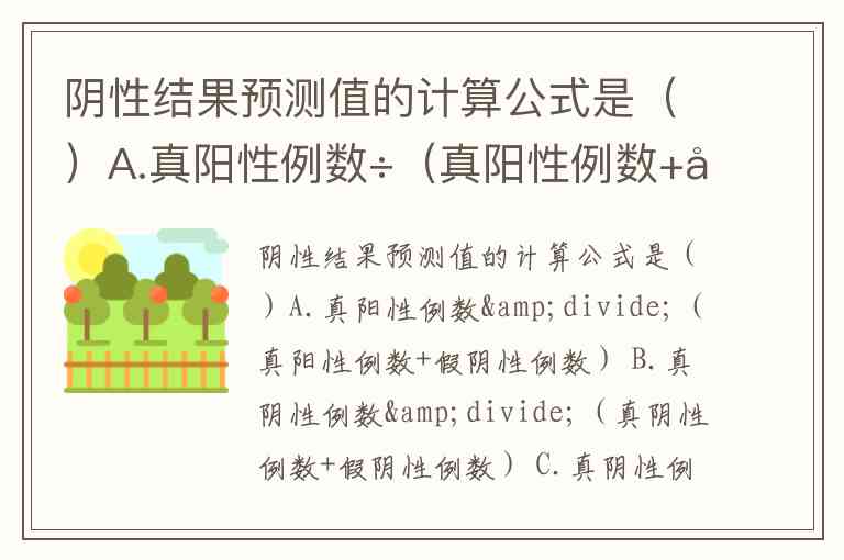 阴性结果预测值的计算公式是()A.真阳性例数÷(真阳性例数+假阴性例数) B.真阴性例数÷(真阴性例数+假阴性例数) C.真阴性例数÷(真阴性例数+假阳性例数) D.阴性例数÷(真阳性例数+假阴性例数) E.假阳性例数÷(真阴性例数+假阳性例数)