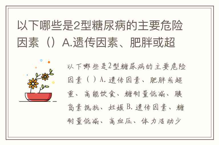 以下哪些是2型糖尿病的主要危险因素()A.遗传因素、肥胖或超重、高能饮食、糖耐量低减、胰岛素抵抗、妊娠 B.遗传因素、糖耐量低减、高血压、体力活动少、病毒感染、自身免疫 C.遗传因素、自身免疫、肥胖或超重、高能饮食、高血压 D.病毒感染、遗传因素、自身免疫、其他环境因素 E.病毒感染、妊娠、遗传因素、胰岛素抵抗、高能饮食