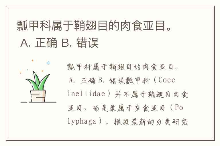 因此,题目中的说法错误,正确分类应为鞘翅目多食亚目。这一结论不仅被分子系统学研究证实,也符合现代昆虫分类系统对瓢甲科形态和生态特征的综合考量。