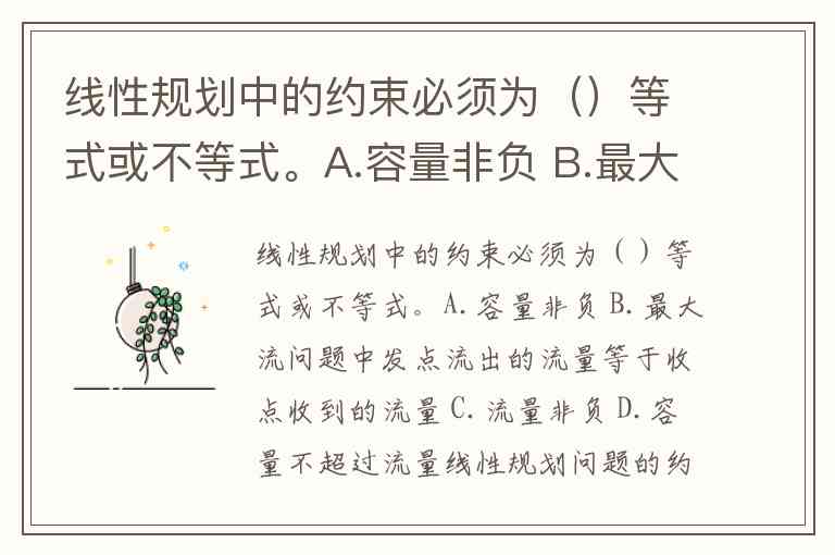 线性规划中的约束必须为()等式或不等式。A.容量非负 B.最大流问题中发点流出的流量等于收点收到的流量 C.流量非负 D.容量不超过流量