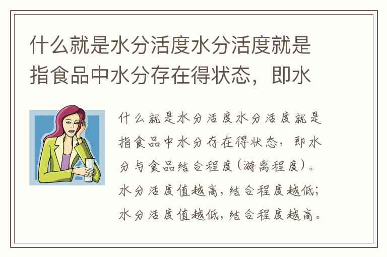 什么就是水分活度水分活度就是指食品中水分存在得状态,即水分与食品结合程度(游离程度)。水分活度值越高,结合程度越低;水分活度值越低,结合程度越高。水分活度数值用Aw表示得,水分活度值等于用百分率表示得相对湿度,其数值在0—1之间。溶液中水得蒸气分压P与纯水__Q得比值,Aw=P/Q。