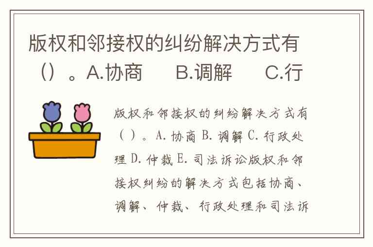 版权和邻接权的纠纷解决方式有()。A.协商 B.调解 C.行政处理 D.仲裁 E.司法诉讼