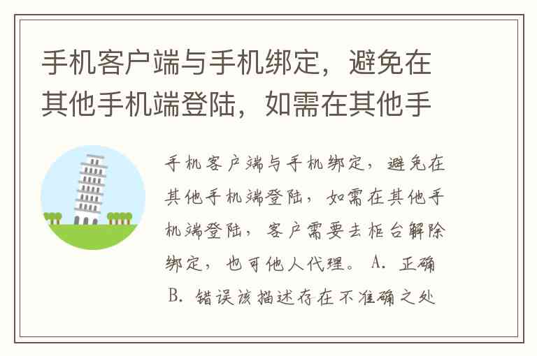 手机客户端与手机绑定,避免在其他手机端登陆,如需在其他手机端登陆,客户需要去柜台解除绑定,也可他人代理。 A. 正确 B. 错误