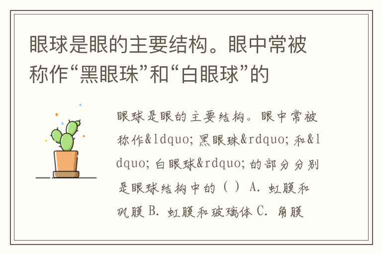 眼球是眼的主要结构。眼中常被称作“黑眼珠”和“白眼球”的部分分别是眼球结构中的() A. 虹膜和巩膜 B. 虹膜和玻璃体 C. 角膜和虹膜 D. 角膜和视网膜