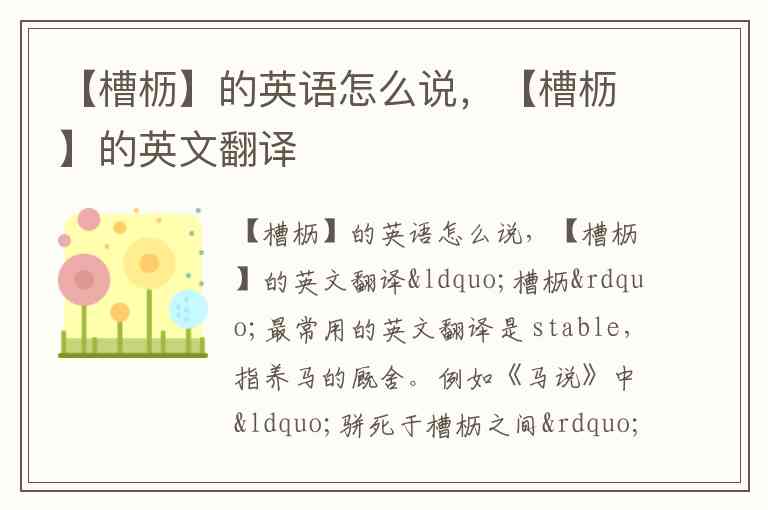 “槽枥”最常用的英文翻译是 stable,指养马的厩舍。例如《马说》中“骈死于槽枥之间”可译为“die side by side in the stable”。
