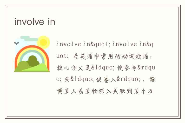 "involve in" 是英语中常用的动词短语,核心含义是“使参与”或“使卷入”,强调某人或某物深入关联到某个活动、事件或情况中,而非简单的表面加入。它的用法灵活,既可以表示主动参与,也可能隐含被动卷入的意味,具体含义需结合语境判断。