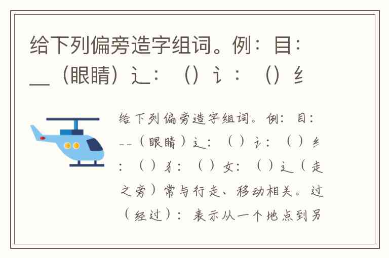 给下列偏旁造字组词。例:目:__(眼睛)辶:()讠:()纟:()犭:()女:()