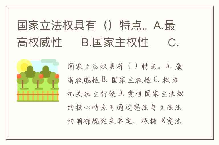 国家立法权具有()特点。A.最高权威性 B.国家主权性 C.权力机关独立行使 D.党性