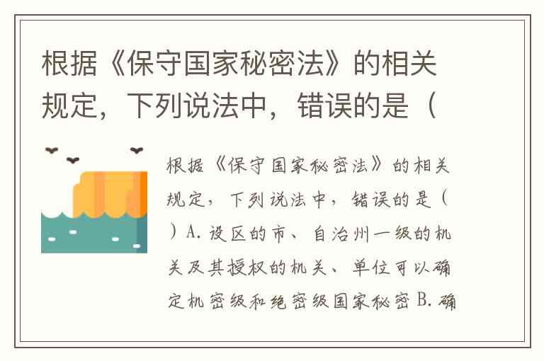 根据《保守国家秘密法》的相关规定,下列说法中,错误的是()A.设区的市、自治州一级的机关及其授权的机关、单位可以确定机密级和绝密级国家秘密 B.确定国家秘密的密级,应当遵守定密权限 C.机关、单位负责人及其指定的人员为定密责任人,负责机关、单位的国家秘密确定、变更和解除工作 D.机关、单位确定、变更和解除机关、单位的国家秘密,应当由承办人提出具体意见,经定密责任人审核批准