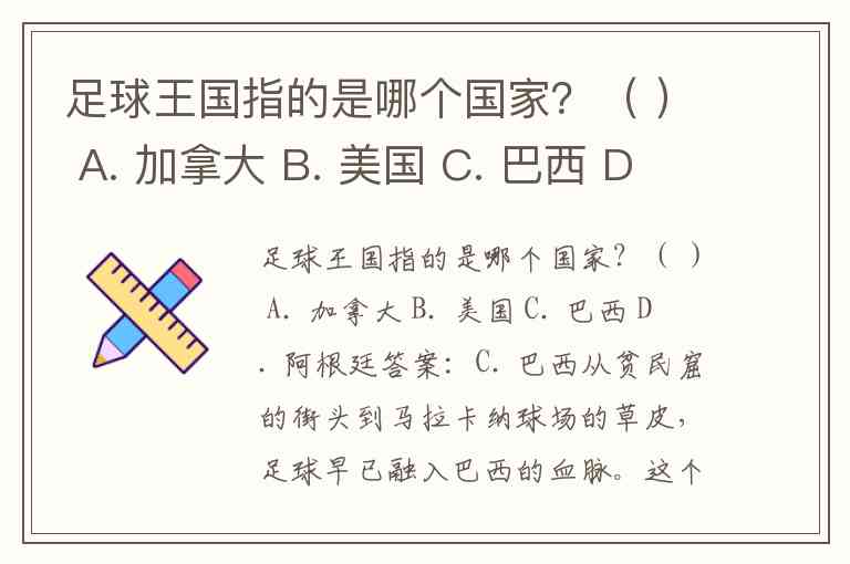 足球王国指的是哪个国家?( ) A. 加拿大 B. 美国 C. 巴西 D. 阿根廷