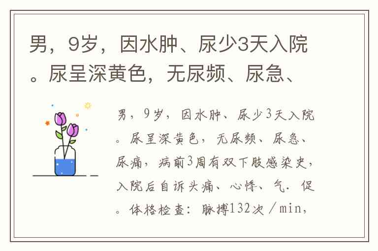 根据患儿临床表现(水肿、尿少、深黄色尿、病前3周双下肢感染史)及体征(血压128/90mmHg、心率132次/min、呼吸42次/min、双肺底湿啰音、肝大),需优先考虑急性肾小球肾炎合并急性左心衰竭。其核心矛盾为水钠潴留导致的循环负荷过重,引发肺水肿及心功能不全,此时最紧急的处理是快速减轻容量负荷。