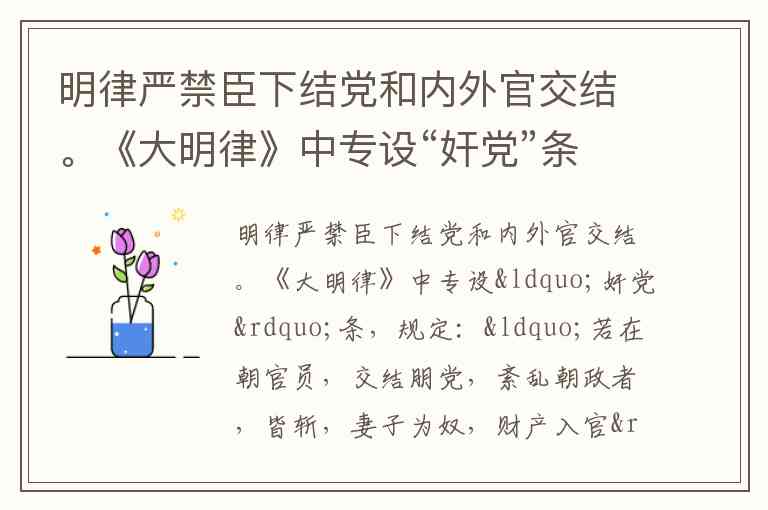 明律严禁臣下结党和内外官交结。《大明律》中专设“奸党”条,规定:“若在朝官员,交结朋党,紊乱朝政者,皆斩,妻子为奴,财产入官”。