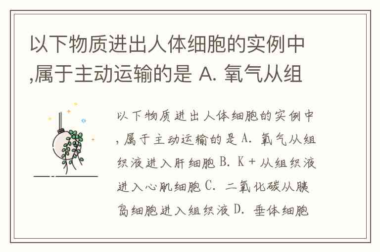 以下物质进出人体细胞的实例中,属于主动运输的是 A. 氧气从组织液进入肝细胞 B. K+从组织液进入心肌细胞 C. 二氧化碳从胰岛细胞进入组织液 D. 垂体细胞分泌促甲状腺激素