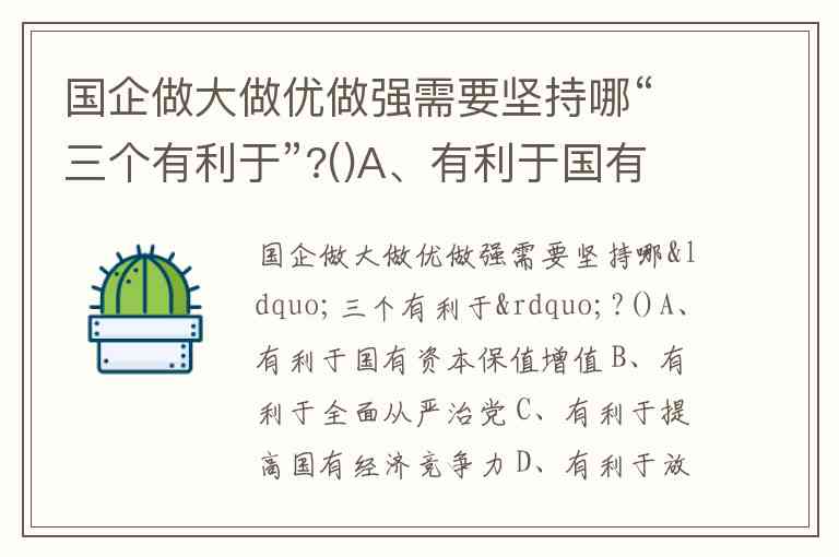 国企做大做优做强需坚持的“三个有利于”,是习近平总书记提出的改革价值判断标准,具体为有利于国有资本保值增值、有利于提高国有经济竞争力、有利于放大国有资本功能,对应选项A、C、D。这一标准自2015年提出以来,始终是国企改革的核心遵循。