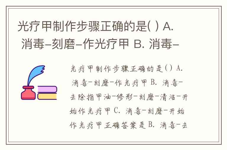 光疗甲制作步骤正确的是( ) A. 消毒-刻磨-作光疗甲 B. 消毒-去除指甲油-修形-刻磨-清洁-开始作光疗甲 C. 消毒-刻磨-开始作光疗甲