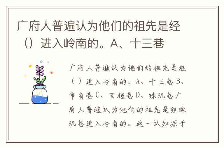 广府人普遍认为他们的祖先是经()进入岭南的。A、十三巷 B、华南巷 C、百越巷 D、珠玑巷