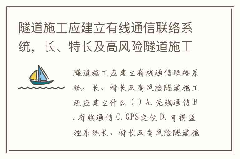 隧道施工应建立有线通信联络系统,长、特长及高风险隧道施工还应建立什么()A.无线通信 B.有线通信 C.GPS定位 D.可视监控系统