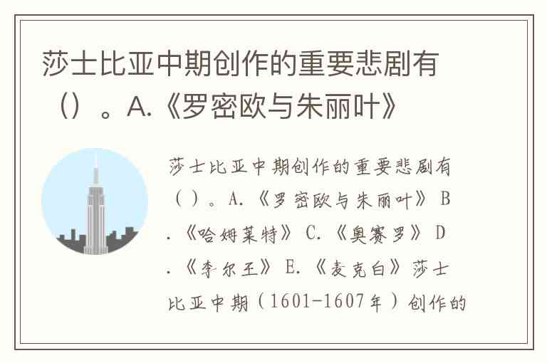 莎士比亚中期(1601-1607年)创作的重要悲剧以"四大悲剧"为核心,包括《哈姆莱特》《奥赛罗》《李尔王》《麦克白》,对应选项B、C、D、E。这一时期正值英国社会矛盾激化,詹姆士一世继位后政治经济形势恶化,莎士比亚的创作风格从早期明快乐观转向阴郁悲愤,作品深刻揭露了人文主义理想与现实的矛盾。