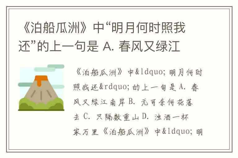 《泊船瓜洲》中“明月何时照我还”的上一句是A. 春风又绿江南岸。这是北宋诗人王安石的名作,全诗为:“京口瓜洲一水间,钟山只隔数重山。春风又绿江南岸,明月何时照我还?”