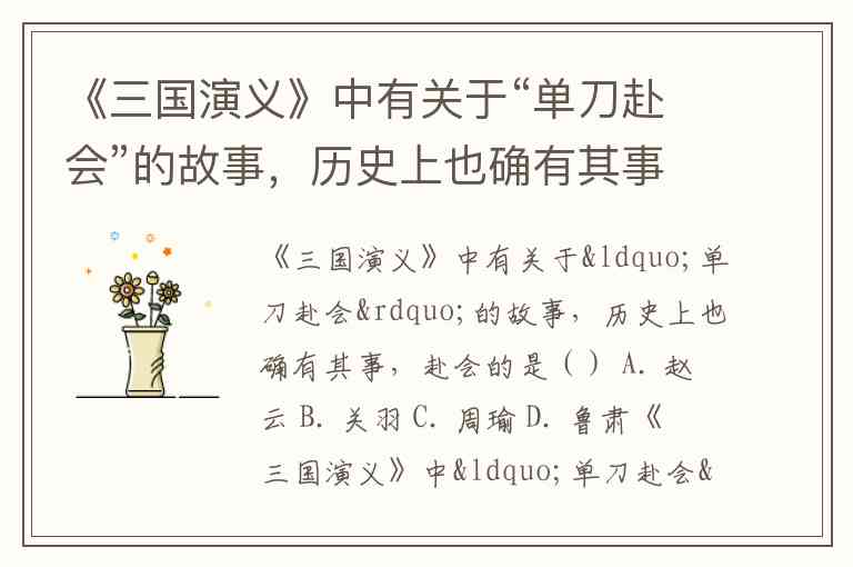 《三国演义》中有关于“单刀赴会”的故事,历史上也确有其事,赴会的是() A. 赵云 B. 关羽 C. 周瑜 D. 鲁肃