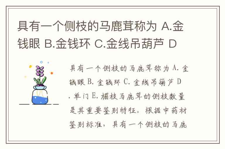 具有一个侧枝的马鹿茸称为 A.金钱眼 B.金钱环 C.金线吊葫芦 D.单门 E.楣枝