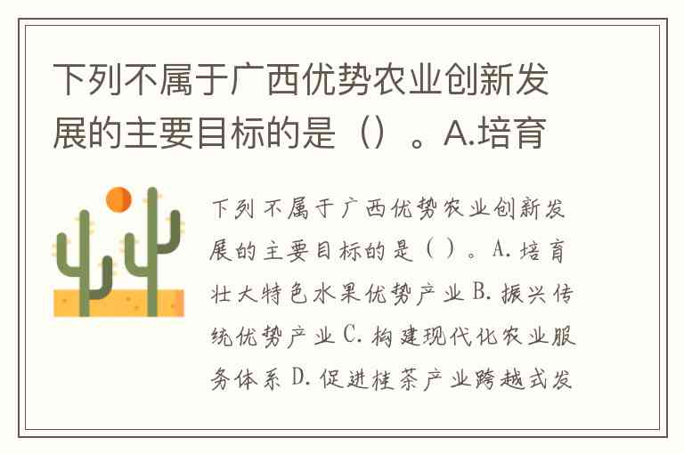 下列不属于广西优势农业创新发展的主要目标的是()。A.培育壮大特色水果优势产业 B.振兴传统优势产业 C.构建现代化农业服务体系 D.促进桂茶产业跨越式发展