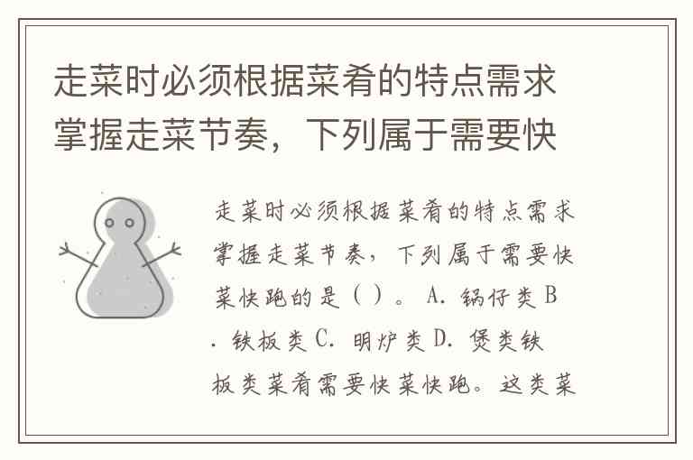走菜时必须根据菜肴的特点需求掌握走菜节奏,下列属于需要快菜快跑的是()。 A. 锅仔类 B. 铁板类 C. 明炉类 D. 煲类
