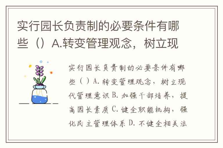 实行园长负责制的必要条件有哪些()A.转变管理观念,树立现代管理意识 B.加强干部培养,提高园长素质 C.健全职能机构,强化民主管理体系 D.不健全相关法律法规,依法办园
