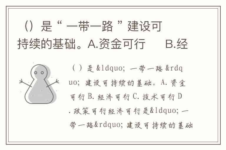 ()是 “ 一带一路 ” 建设可持续的基础。A.资金可行 B.经济可行 C.技术可行 D.政策可行