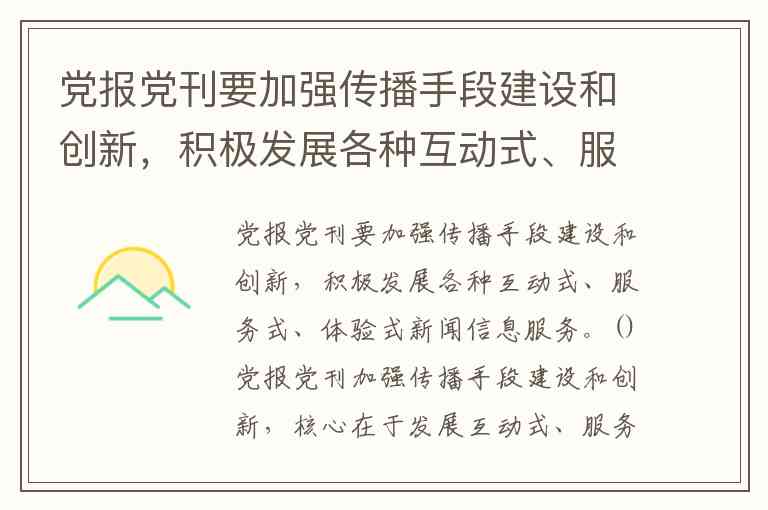 党报党刊加强传播手段建设和创新,核心在于发展互动式、服务式、体验式新闻信息服务,这是习近平总书记多次强调的媒体融合发展方向。这三种服务模式共同构成了主流媒体适应互联网时代传播规律、提升舆论引导能力的关键路径,旨在实现新闻传播的"全方位覆盖、全天候延伸、多领域拓展",推动党的声音直接进入各类用户终端。