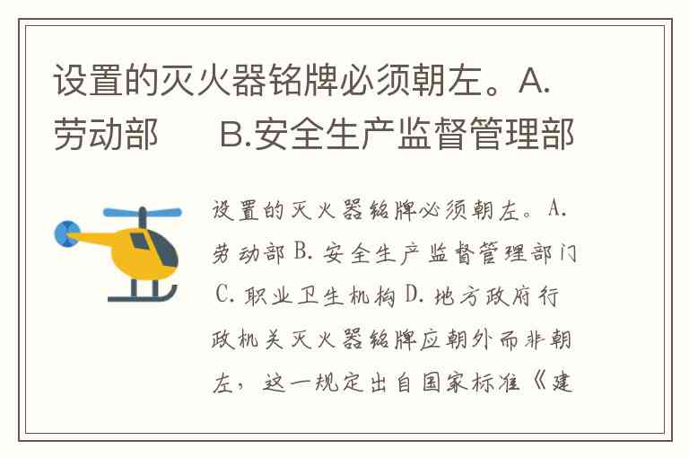 设置的灭火器铭牌必须朝左。A.劳动部 B.安全生产监督管理部门 C.职业卫生机构 D.地方政府行政机关