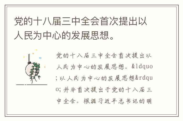“以人民为中心的发展思想”并非首次提出于党的十八届三中全会。根据习近平总书记的明确表述,这一重要思想是在2015年10月党的十八届五中全会上首次提出的,其核心是“把增进人民福祉、促进人的全面发展作为发展的出发点和落脚点”。十八届三中全会(2013年11月)虽然未提出这一完整表述,但已蕴含相关理念,例如全会强调改革要“以促进社会公平正义、增进人民福祉为出发点和落脚点”,并在文化体制改革中明确“坚持以人民为中心的工作导向”。
