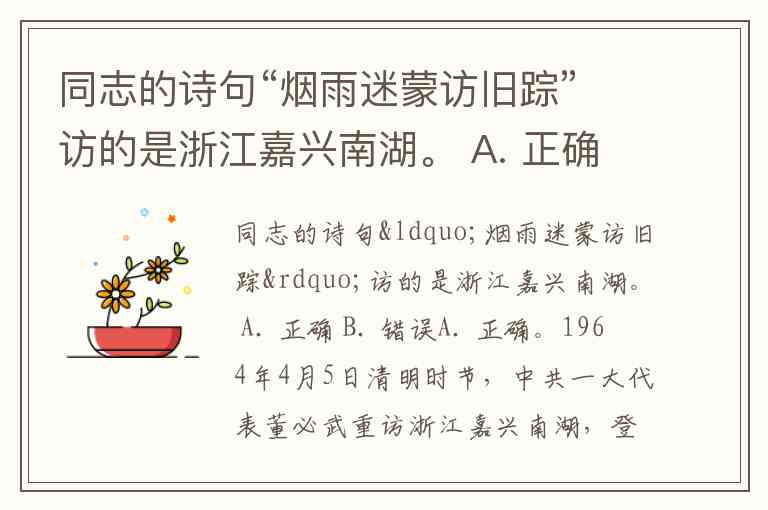 同志的诗句“烟雨迷蒙访旧踪”访的是浙江嘉兴南湖。 A. 正确 B. 错误
