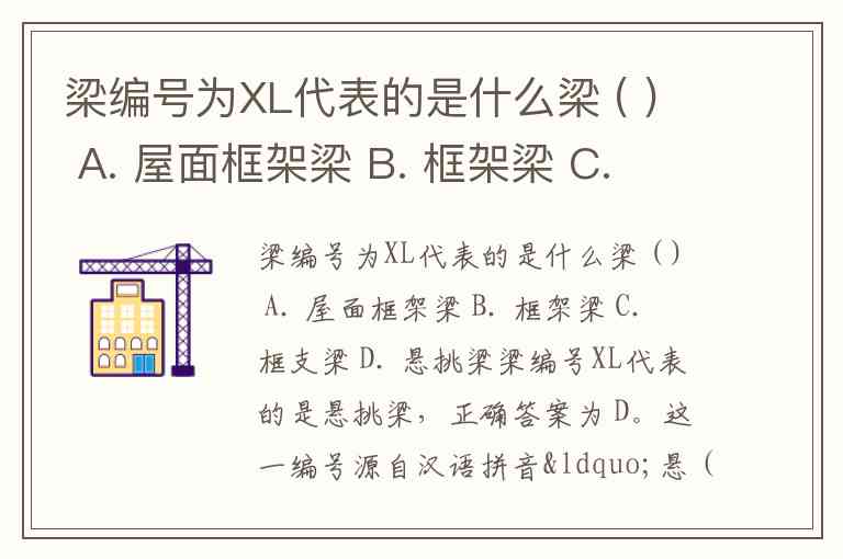 梁编号XL代表的是悬挑梁,正确答案为 D。这一编号源自汉语拼音“悬(Xuán)挑(Tiǎo)梁(Liáng)”的首字母组合,是建筑工程中用于标注一端固定、另一端悬空的梁结构的标准代号。
